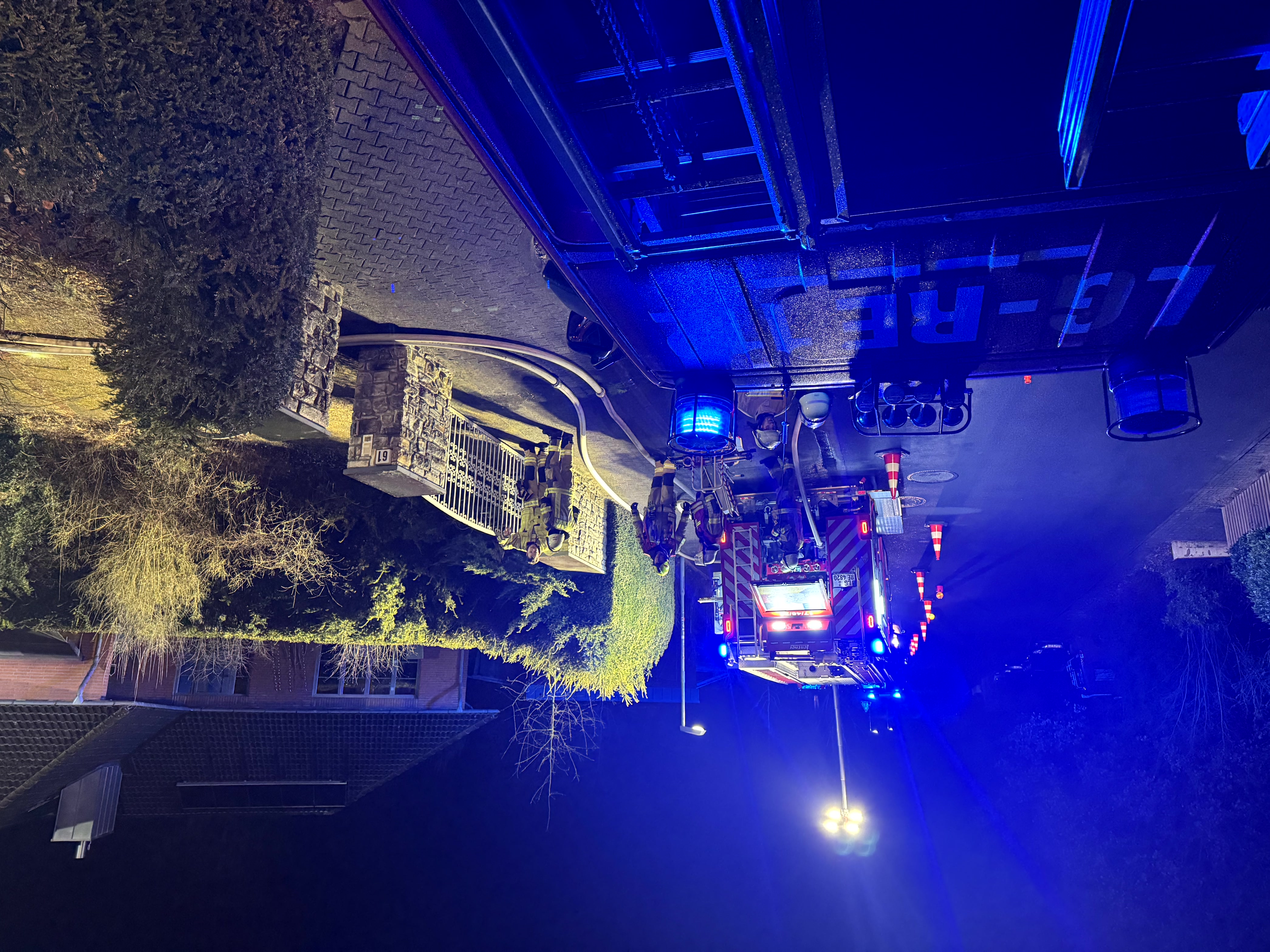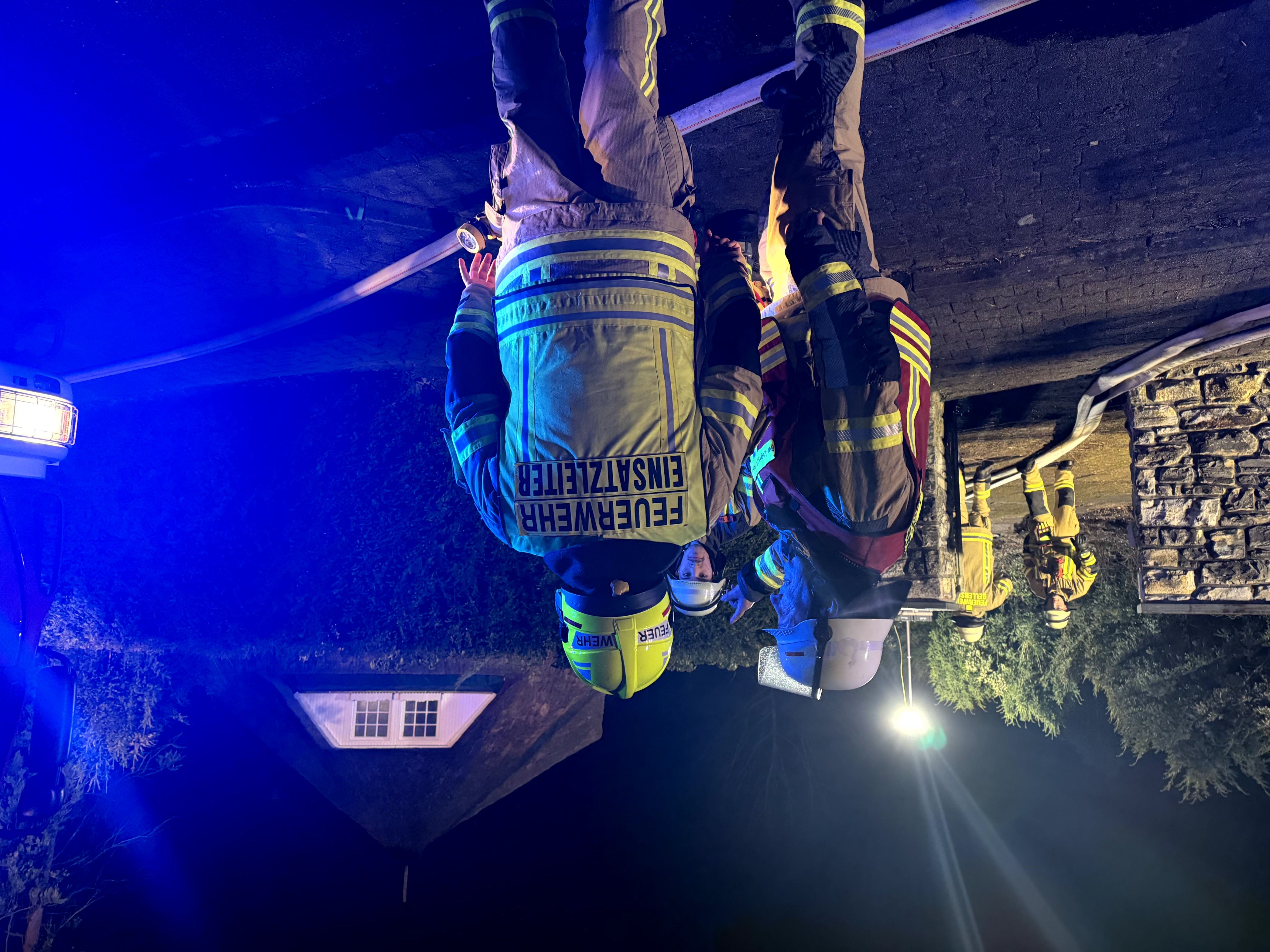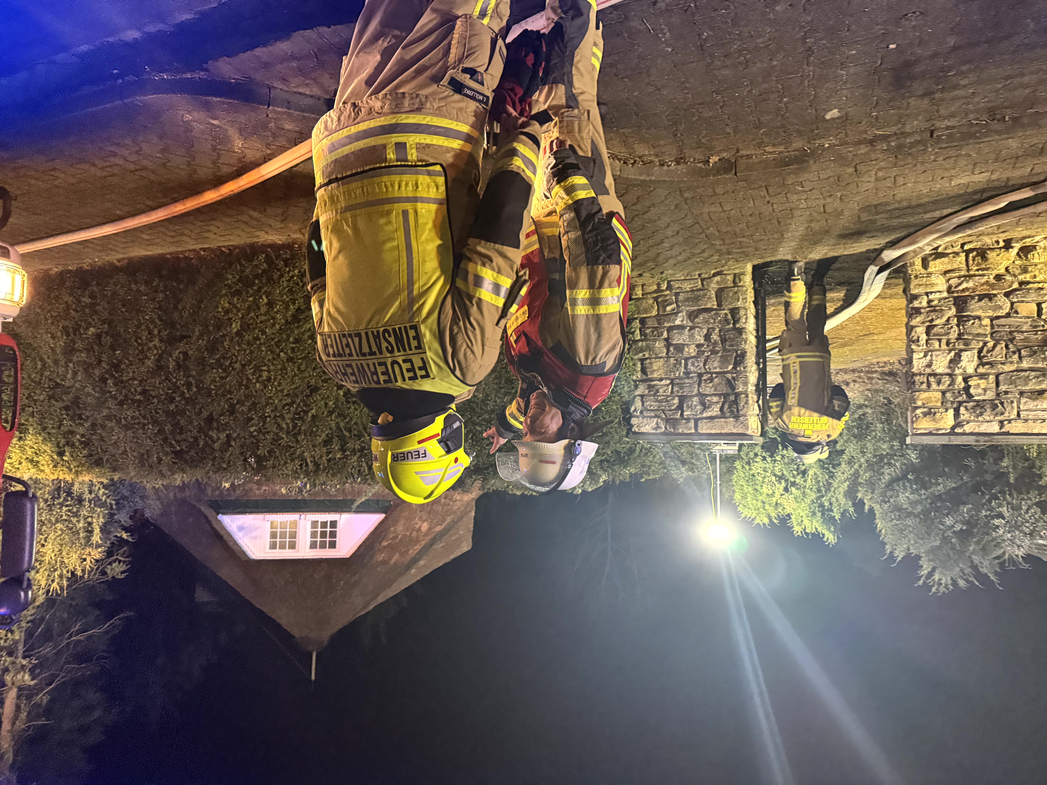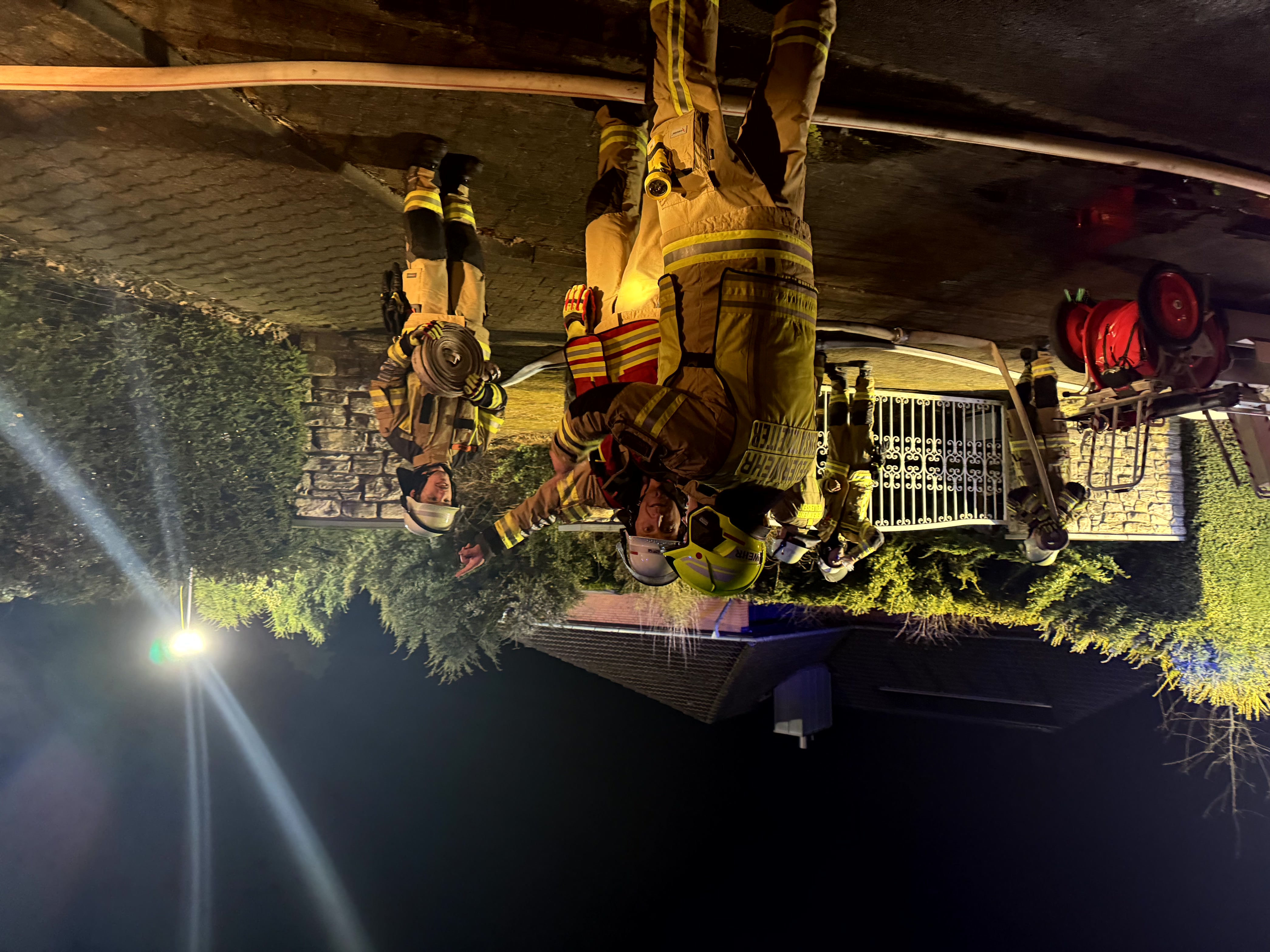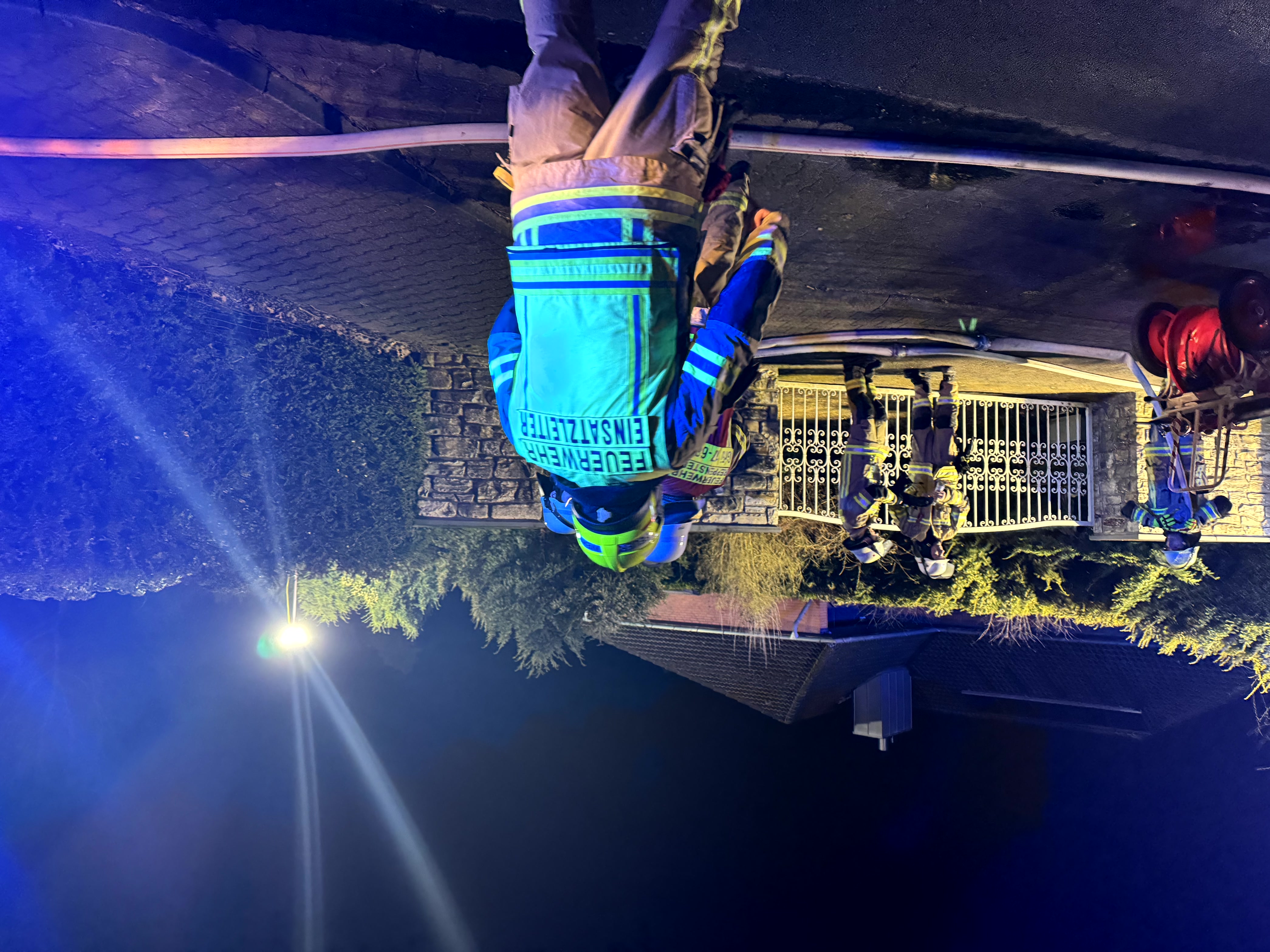 Unsere Atemschutztrupps gingen zügig zur Menschenrettung vor, während parallel der Brand im Keller be-kämpft wurde. Die Person im Obergeschoss konnte sicher über eine tragbare Leiter gerettet werden. Insge-samt waren 30 Kameradinnen und Kameraden im Einsatz, unterstützt durch mehrere Trupps unter Atem-schutz und zwei C-Rohre zur Brandbekämpfung.