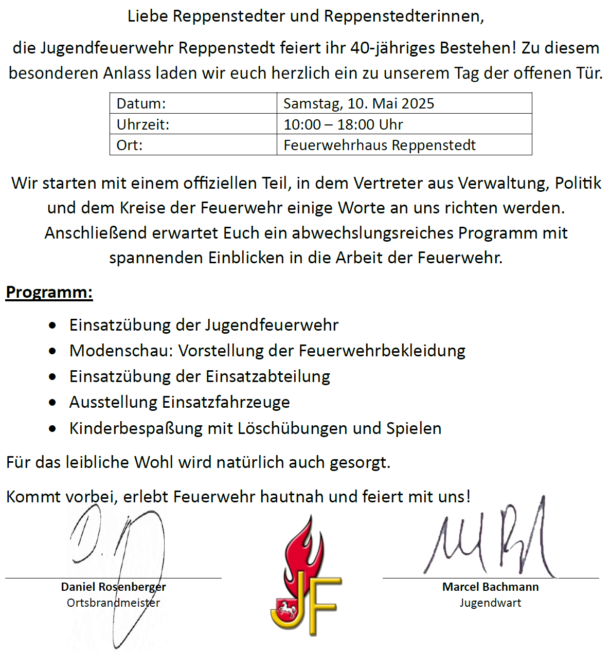 Ab 10 Uhr geht’s offiziell los – mit Reden, Ehrungen und einem Blick zurück auf 40 Jahre Jugendfeuerwehr. Wer auf Action, Spaß und Feuerwehr zum Anfassen aus ist, sollte ab ca. 11 Uhr unbedingt vorbeischauen! Dann starten unsere weiteren spannenden Programmpunkte: