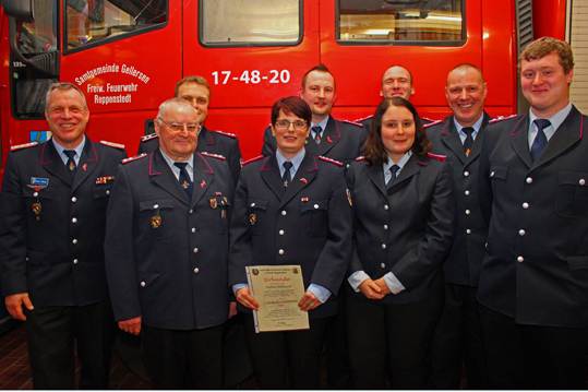 Wie immer auf der Jahreshauptversammlung gab es diverse Beförderungen und Ehrungen. Befördert wurden Thomas Kordylas zum Löschmeister, Nadine Hellmund zur ersten Hauptfeuerwehrfrau, Heiko Krause, Marvin Hellmannzig und Dr. Ralf Berkenthien zum Hauptfeuerwehrmann und Jacqueline Helbig zur Oberfeuerwehrfrau. Auch bei den Gruppenführern gab es Veränderungen. So wird die 1. Gruppe künftig von Hendrik Conrads und die 2. Gruppe von Sascha Arwers geführt werden.