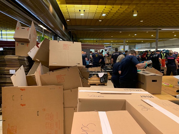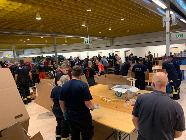 Dort halfen unsere Einsatzkräfte bei der Sortierung und Palettierung der Sachspenden für die Opfer der Hochwasser-Katastrophe.
