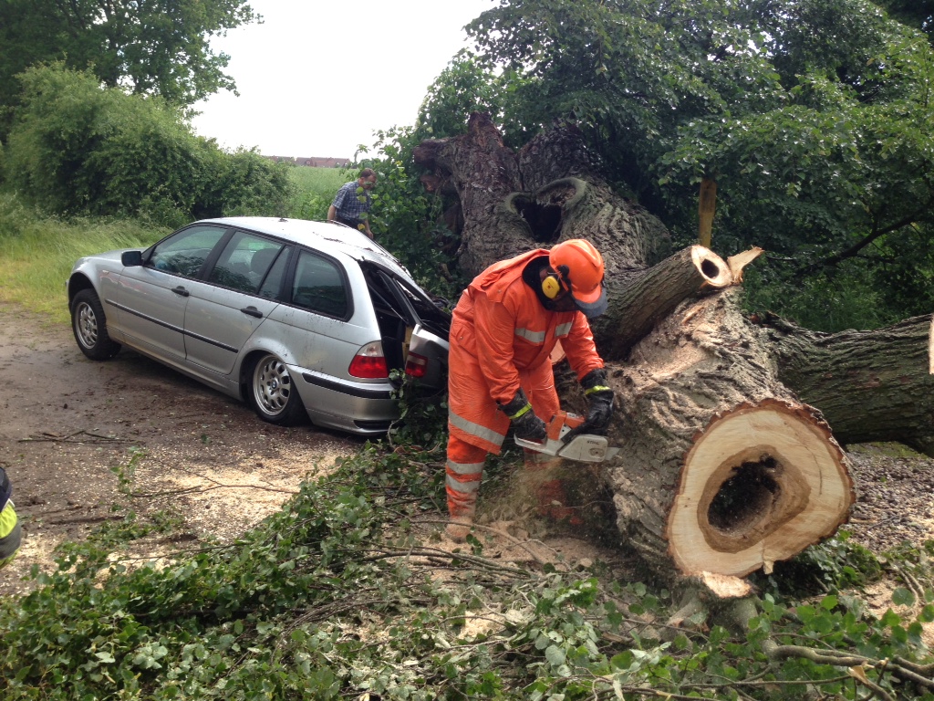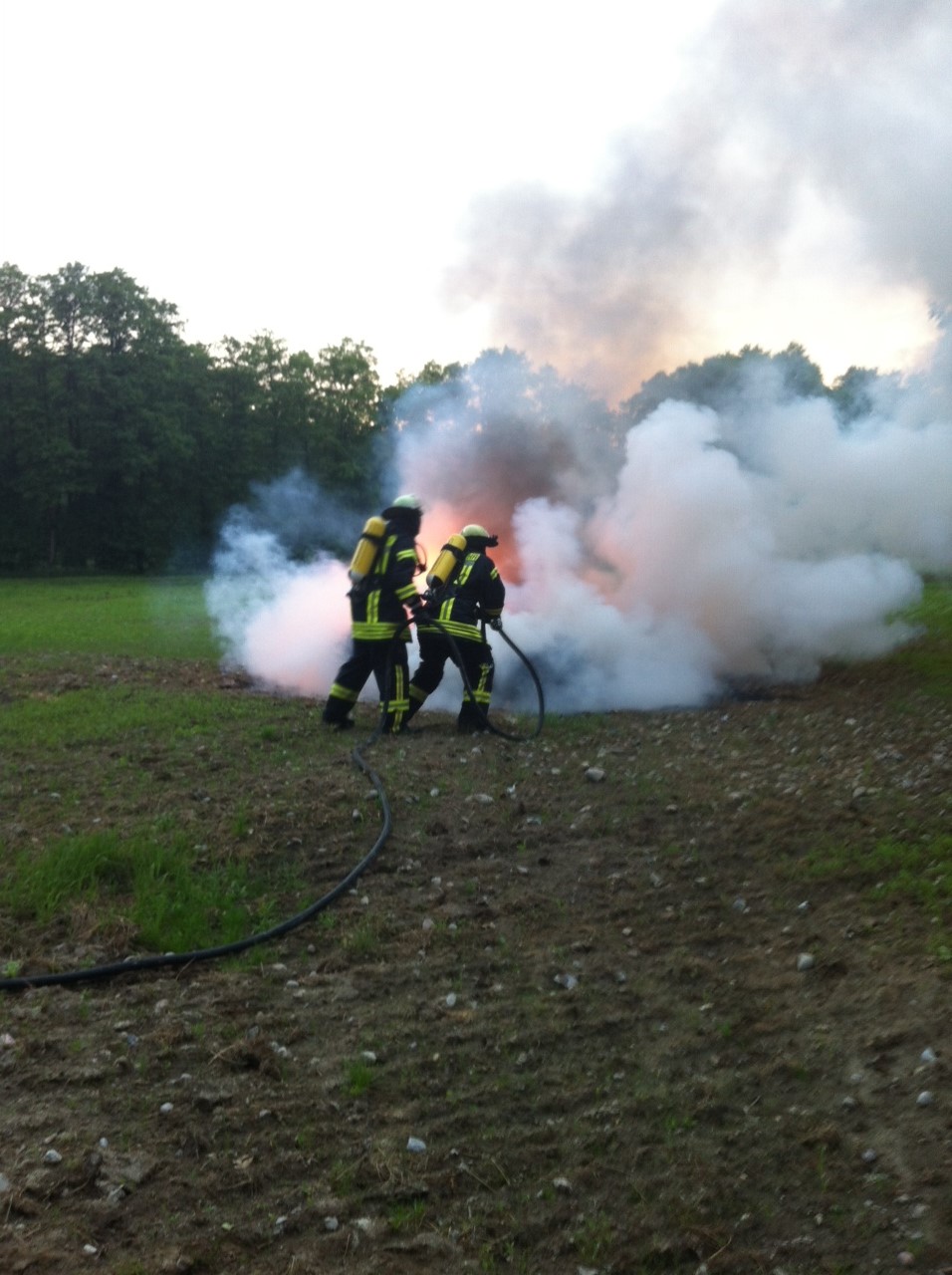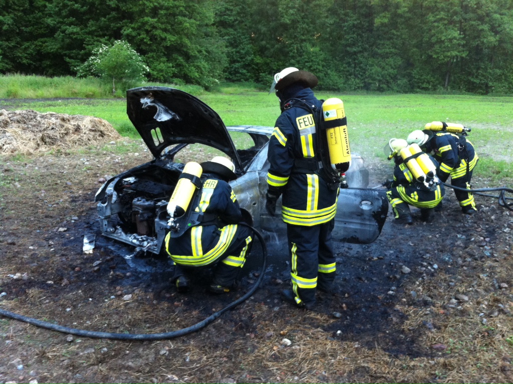 Nachdem unter anderem bei Gartenarbeiten eine Hecke in Brand geraten war und bei dem kurzen Sturm am 15.06.2013 ein Baum ein Auto unter sich begrub, rückten die freiwilligen Helfer am Sonntag, den 23.06.2013 gegen 21:30 erneut aus. „Brennendes Auto“ lautete die Meldung auf die 15 Feuerwehrleute reagierten und mit allen Fahrzeugen ausrückten. Autodiebe hatten ihre Beute auf einem Acker nahe des Schnellenberger Wegs abgestellt und angezündet. Mit zwei Schnellangriffsrohren rückten vier Einsatzkräfte vor und löschten den Pkw ab, an dem es nichts mehr zu retten gab.