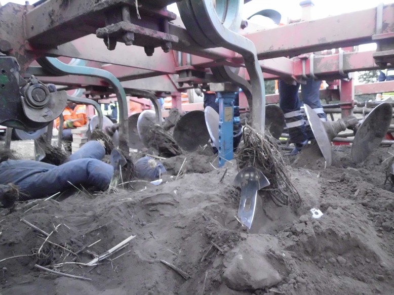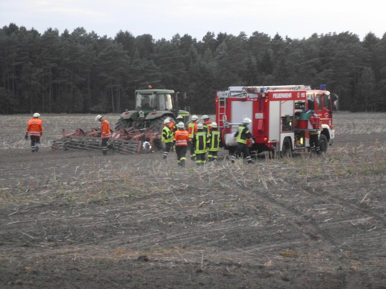 Der Fahrer eines Treckers war von der Maschine gestürzt und unter den angehängten Grobber geraten. Mit hydraulischen Stempeln wurde das Gerät angehoben, mit Holz gegen erneutes abrutschen gesichert, während weitere Kameraden den Boden unter dem Opfer vorsichtig abtrugen, um eine schnelle und möglichst schmerzfreie Bergung zu erreichen.