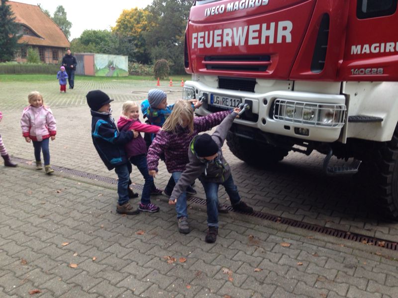 Unter der Anleitung von Sascha Arwers und vier weiteren Kameraden der Feuerwehr durften die Kinder den gesamten Vormittag die Fahrzeuge und Gerätschaften der Feuerwehr ansehen, anfassen und dabei jede Menge Fragen stellen. Neben den Fahrzeugen wurden den Kindern die Atemschutzgeräte erklärt und vorgeführt, wie diese angelegt und benutzt werden können. Auch das Zerschneiden eines Stahlrohres mit Hilfe der Rettungsschere wurde den Kleinen gezeigt. Jeder, auch die Erzieher, durften dann einmal in eine der großen Feuerwehrjacken schlüpfen. Danach konnte jedes Kind schon mal seine Feuerwehrfähigkeiten testen und mit einem echten D-Rohr Tennisbälle von einem Lübecker Hütchen spritzen. Im Anschluss zeigten die "großen" Feuerwehrleute den staunenden SchuKis in einem kleinen Einsatzszenario, wie es bei einem echten Einsatz abläuft und wie schnell das Wasser an den Brandherd gebracht werden kann. Beeindruckt zeigten sich die angehenden ABC Schützen von der großen Wassermasse, die in so kurzer Zeit verspritzt wurde. Der Vormittag, der sowohl den Kindern als auch für die Feuerwehrkameraden sehr viel Spaß gemacht hat, ging dann doch viel zu schnell zu ende. Wir hoffen, dass wir im nächsten Jahr wieder Besuch von den Kindern bekommen.