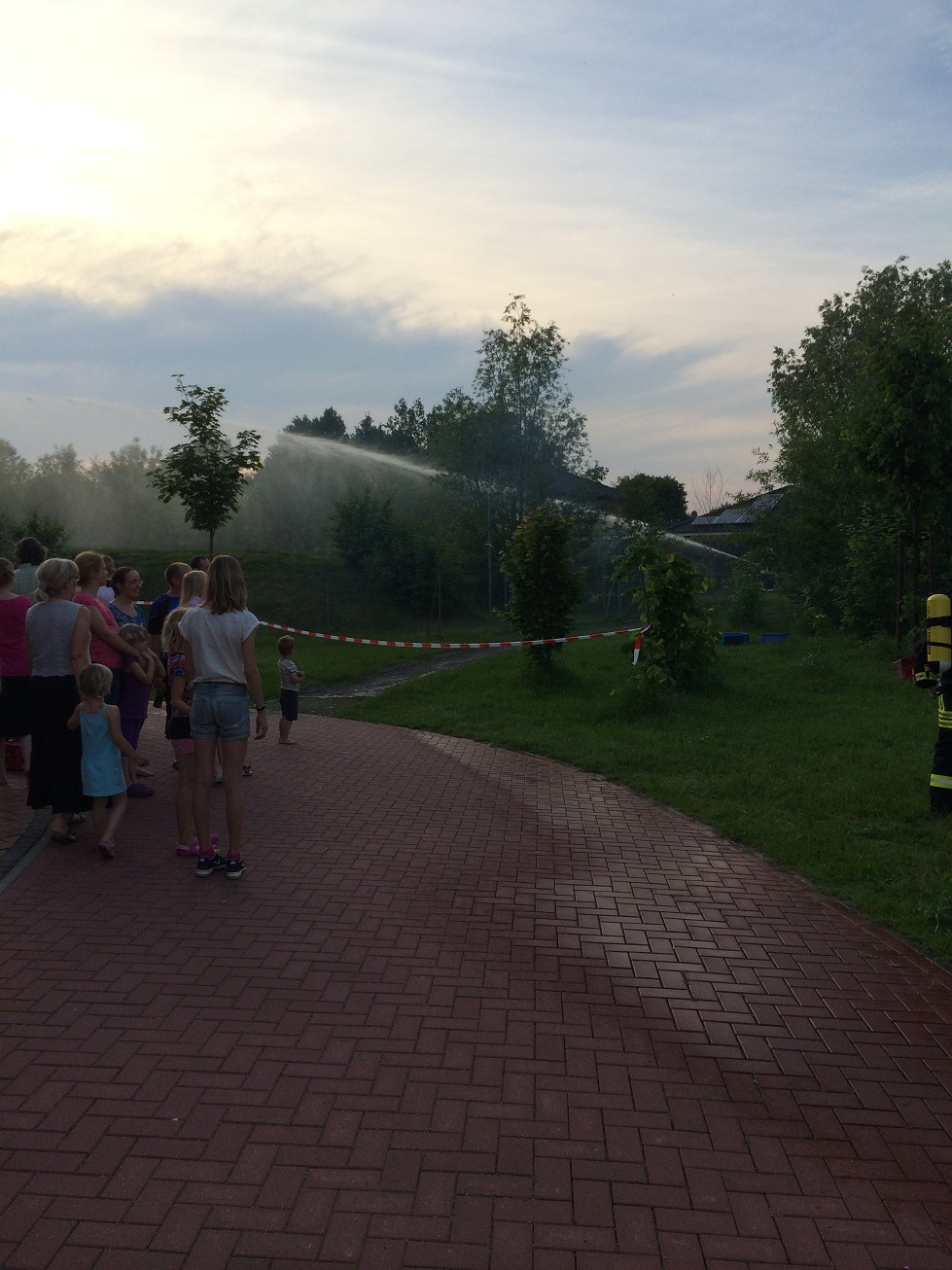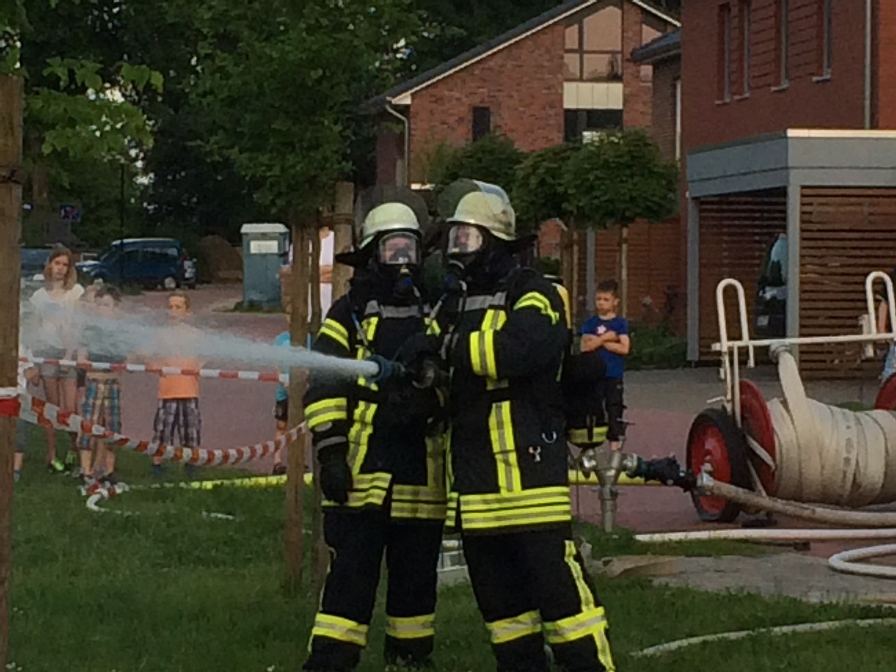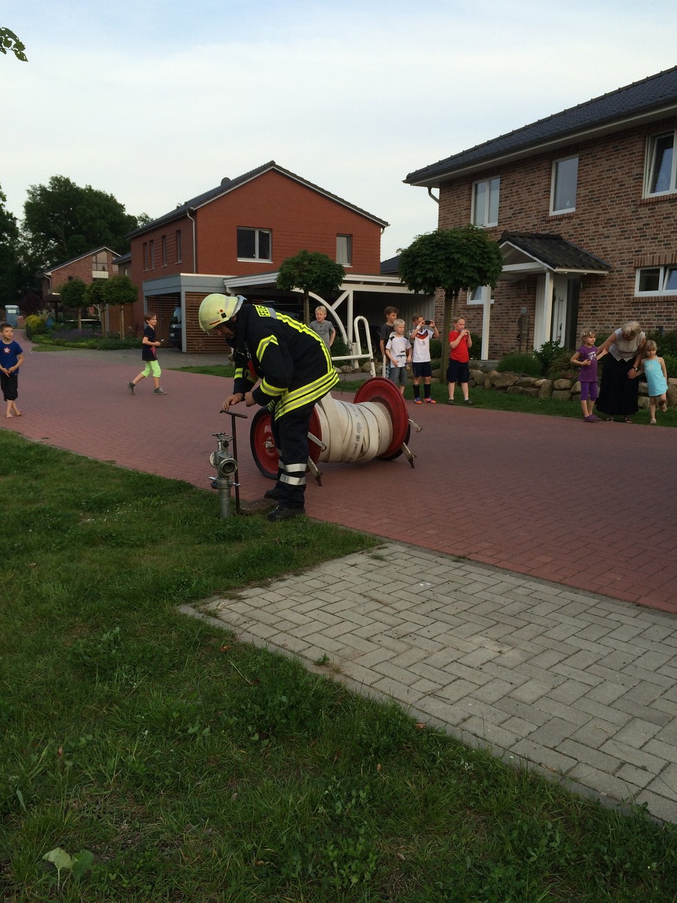 Erfreulich war das große Interesse der Anwohner, die zahlreich erschienen waren und den Einsatzkräften bei deren Arbeit zusahen. Besonders die Kinder freuten sich über die Riegelstellung, die eine angenehme Abkühlung bei den warmen Temperaturen bot. "So macht Übungsdienst doppelt Spaß", meinte Ortsbrandmeister Udo Kleis, der als Maschinist an der Übung teilnahm,"wenn so viele Bürgerinnen und Bürger und Kinder uns bei der Arbeit zusehen!" Unter der Einsatzleitung von Sascha Arwers war dann der Übungs- und Kinderduschdienst nach einer Stunde beendet. Gerne kommen wir wieder zum Üben in dieses Baugebiet.