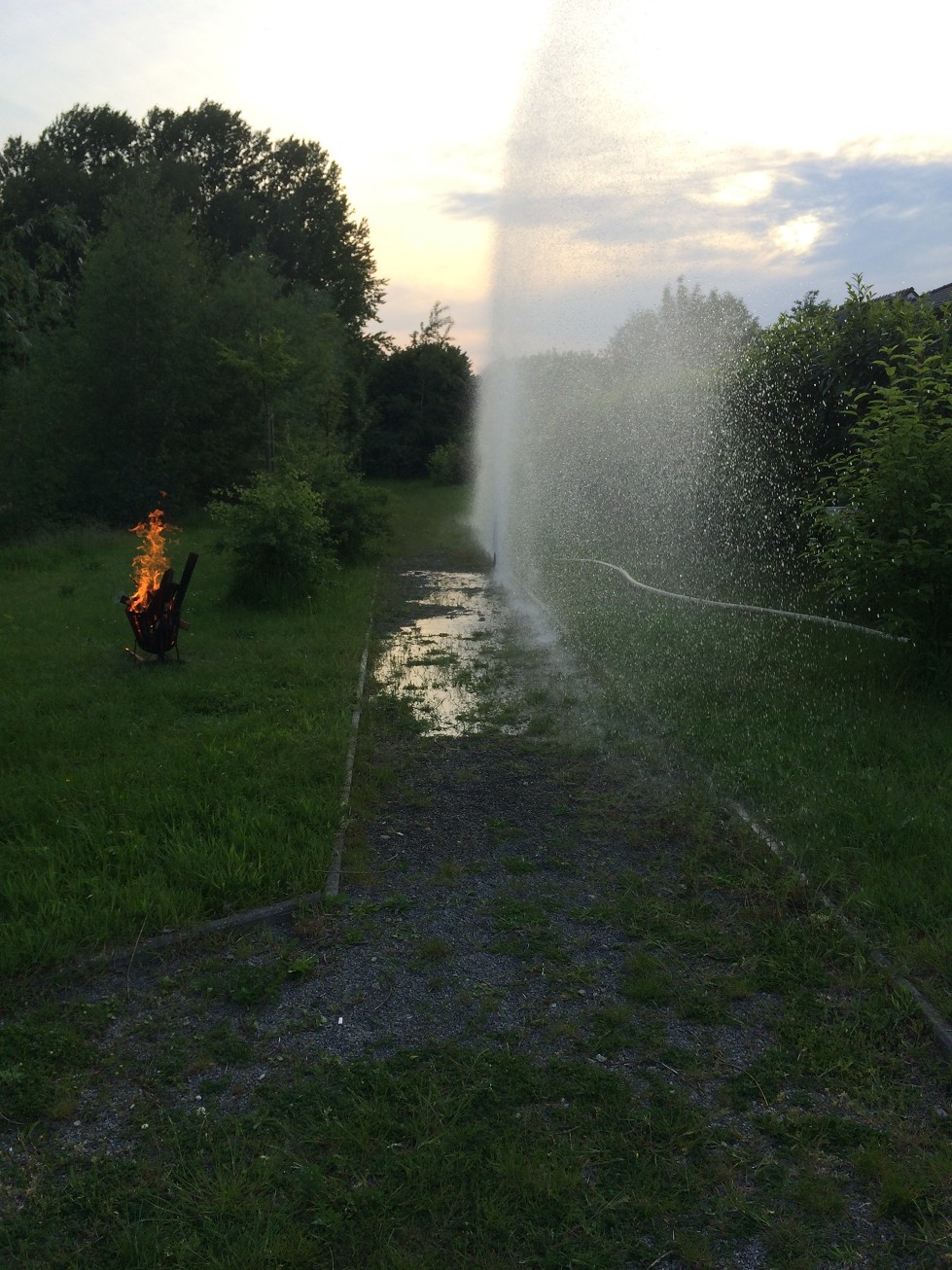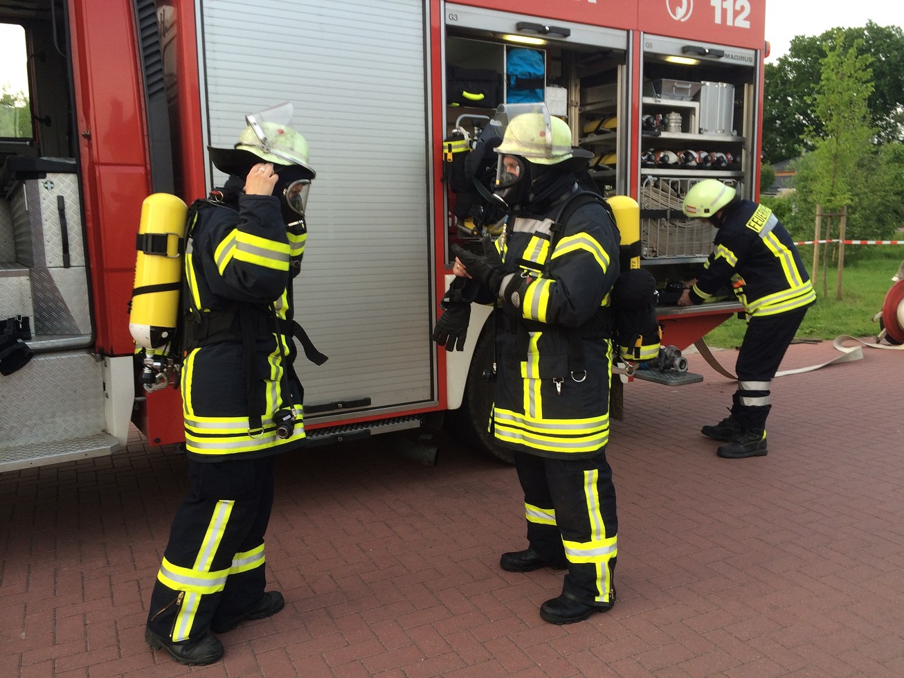 Dieses war die Ausgangslage für eine Übung am 21.05.2014. Die Grünfläche zwischen den Straßenzügen Kämmereihof und Schierborn ist eine solche Fläche, die den naheliegenden Wohnhäusern schnell zum Verhängnis werden kann. Angenommen wurde eine lange Trockenperiode und ein Flächenbrand, der durch starken Wind auf die angrenzenden Häuser überzugreifen drohte. Schnell wurde durch das erste, am Einsatzort eintreffende Fahrzeug, eine Riegelstellung mit einem sogenannten Hydroschild errichtet, um die Wohnhäuser zu schützen. Das zweite Fahrzeug, welches kurze Zeit später an der Einsatzstelle eintraft, übernahm dann die Feuerbekämpfung, die durch drei brennende Feuerkörbe angedeutet wurde, so dass die Lage schnell unter Kontrolle gebracht werden konnte.